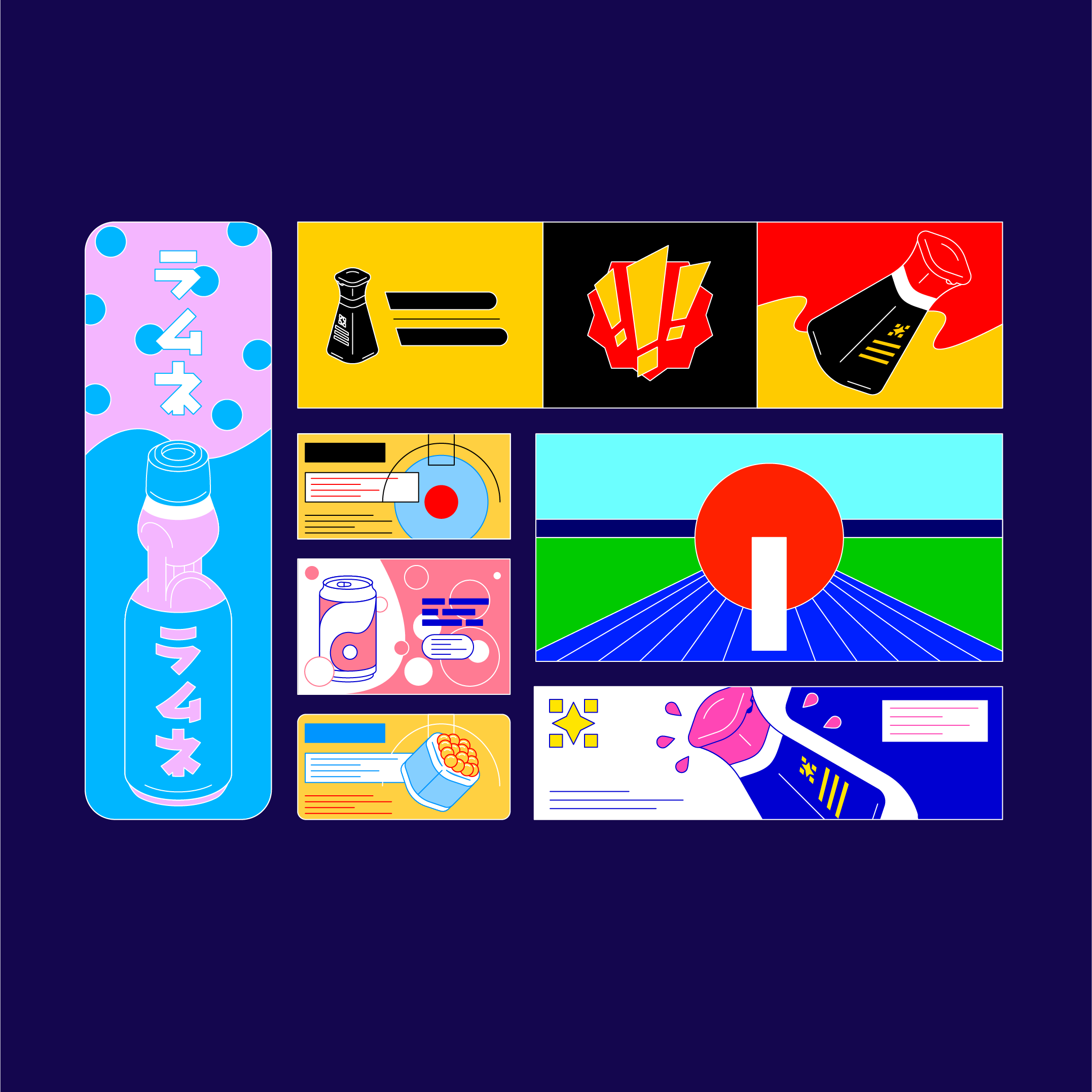 A large illustration developed out of my love and interest in Japanese-inspired foods, signage, and machines. You can see a more detailed version of the Sushi, Ramune, and Vending Machines here.
