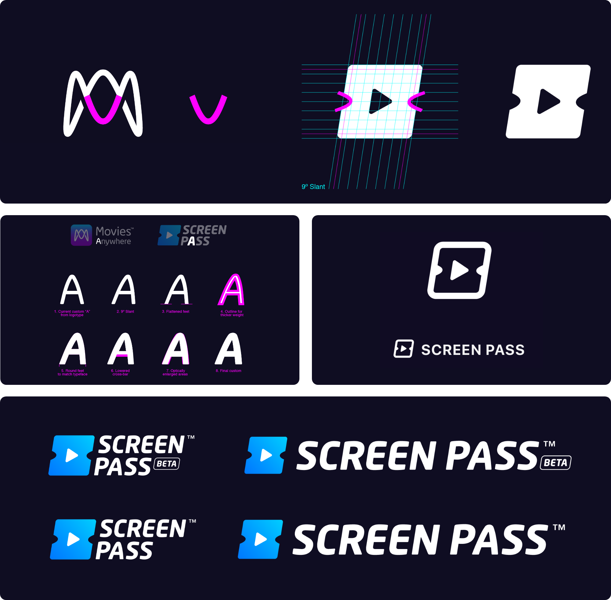 To make this logo trademarkable we pulled in the bottom curve of the Movies Anywhere logo to be the cuts in the pass and then I took the customized Neo Sans ‘A’ from the brand’s logotype and developed a middle ground between that and the normal Neo Sans ‘A’.